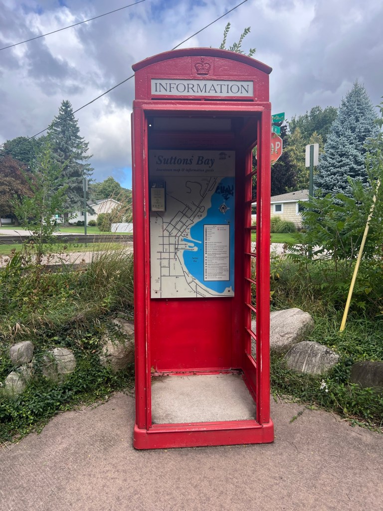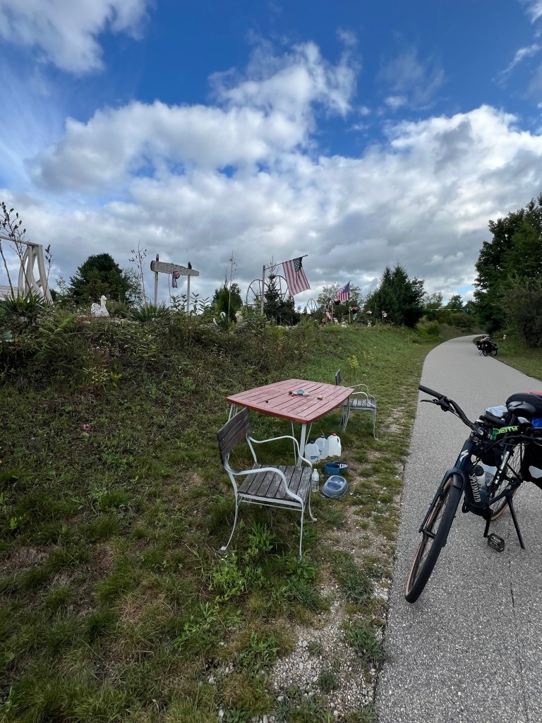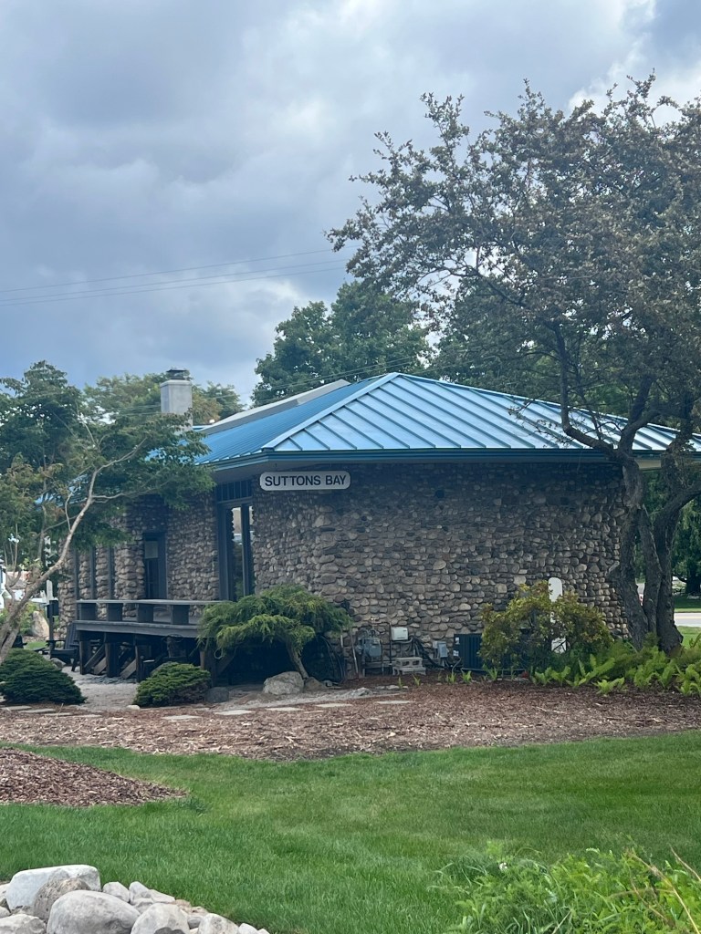 We actually headed out at 8am. Earliest start yet. It was chilly this morning… high 40’s. We bundled up and headed down the road into Traverse City downtown with the rest of everyone heading to work. There was some major construction leaving TC going north… cars were backed up for blocks. Consequently we missed our trail transition from TART trail to Leelanau Trail. We found a road we could take and meet up with the trail… reroute… it just required going up a road called Lakeview Hills Dr! You guessed it… we were going to have to climb up and over to the trail. Eventually I ended up walking the last pitch. I wasn’t cold anymore but the descent to the trail fixed that temperature regulation. Back to chilly! Once we were on the trail the next 10 miles flew by to Sutton’s Bay. These little towns near Traverse Bay are pretty cute. I imagine they’re swarming with tourists all summer.