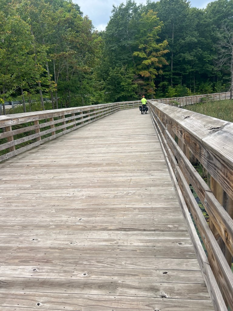 After lunch we headed west and had a long climb toward Lake Michigan. Then we would be heading south to Glen Arbor. It was a mix of highway and bicycle trail. The bicycle trail was along the Sleeping Bear Dunes National Lakeshore. That section of trail was gravel… but it was small and pretty firm for us.