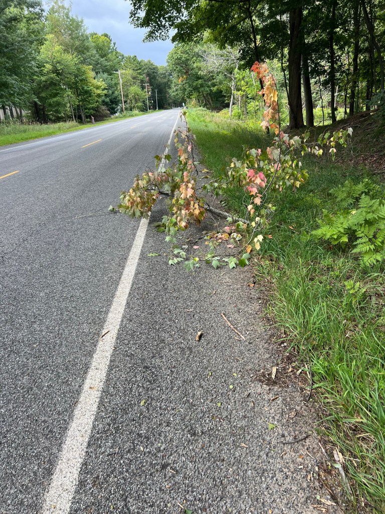 The last two days the shoulder was littered with twigs and sticks from the high winds. It was like dodging debris as we rode. When you were going downhill fast you had to be super careful because sometimes the sticks were big or clumped together. This was the second complete road block we encountered. In this case we stopped to move it off the shoulder.