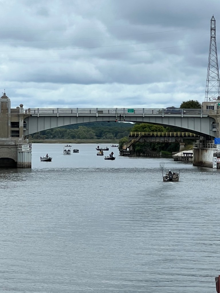 Fishing in Manistee is plentiful .. Coho, King Salmon and steelhead are returning to the lake this time of year. So many good fish to catch. The boats are at the mouth of the river into Manistee Lake.