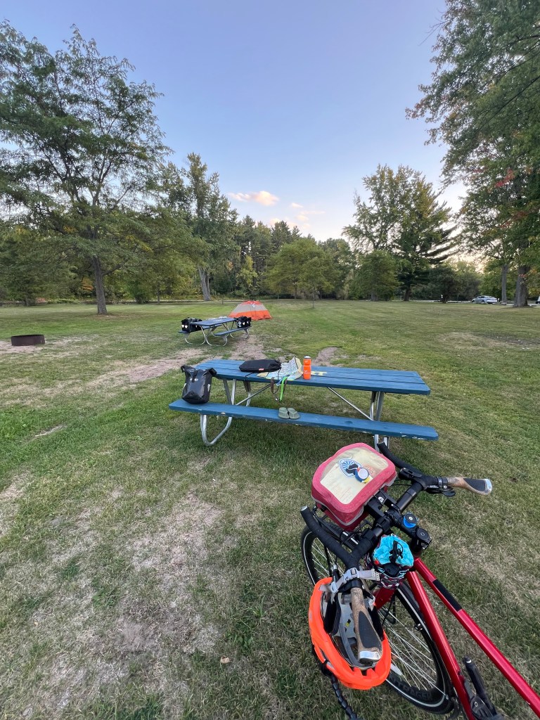 Today was chatty… we met so many people today that were curious about us even though they were bicycling too. Seemed like every town we stopped for a snack and water there was someone that was interested in our mode of travel, where we were going… where we started… where we’re from. Even when we got to the campground our neighbors came by to visit. I think that’s pretty special. It’s not typical when you’re in a car.