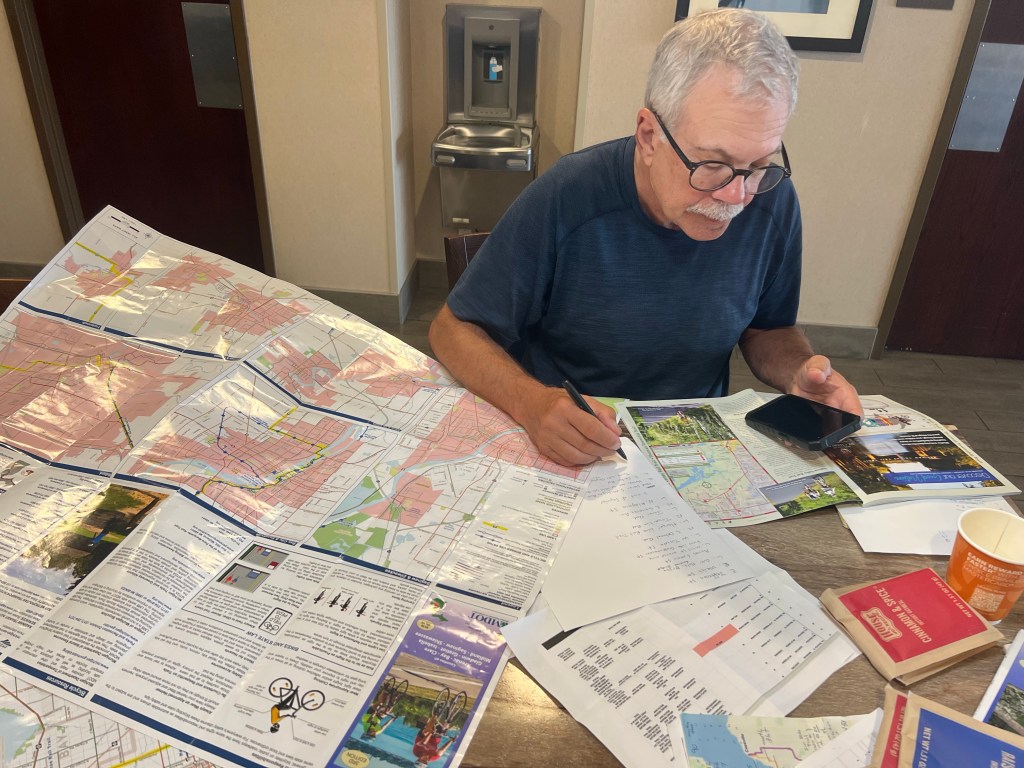 This hotel was busy with middle school age girls softball teams and parents. That made the hotel breakfast busy this morning too! Usually it’s been pretty quiet. After breakfast we moved into the huge lobby where they had a nice big long table we could spread out maps and papers and dial in the 9-10 days of the trip we have remaining.