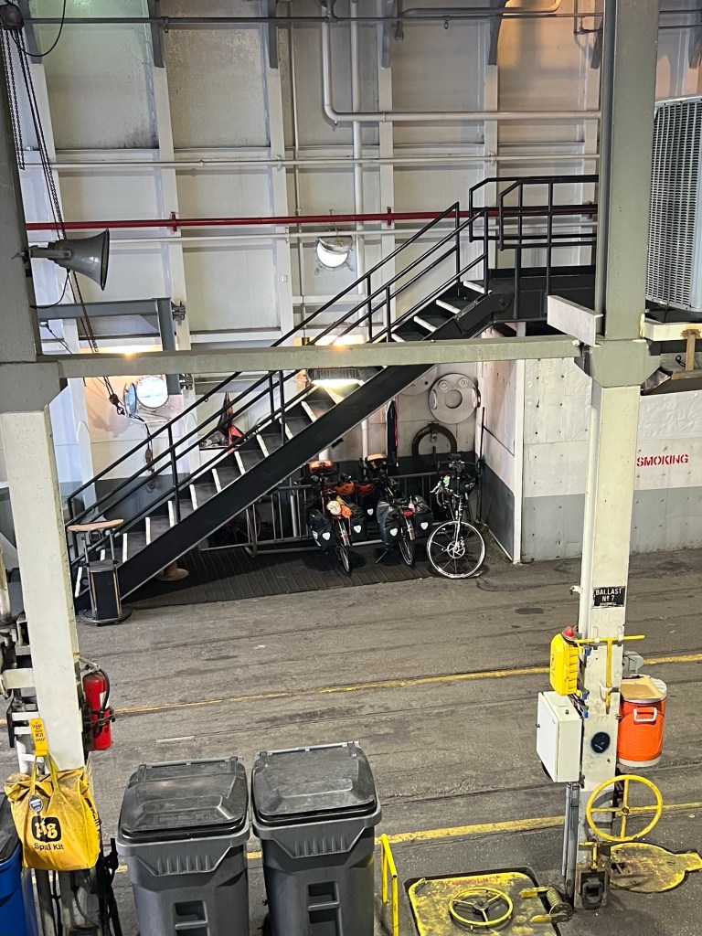 Packed the bikes and arrived about 8:15 at the ferry landing. It was a short ride from the motel. We walked our bikes onto the ferry and they had a “spot” with a rack for bikes off the left side at the back of the ferry.