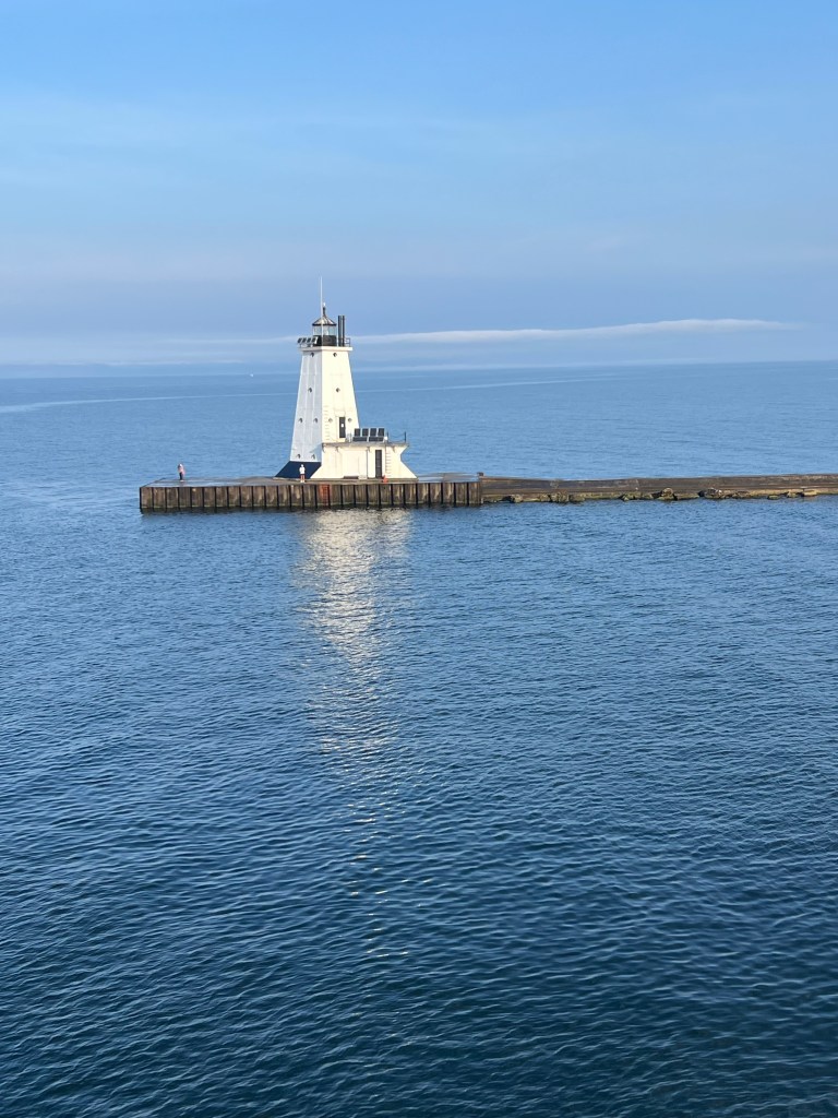 The SS Badger was built in 1953 in Sturgeon Bay WI for the C & O Railway. They used to transport railroads cars underneath where the cars are now loaded. I read there were 14 ferries in its prime. This ferry runs 2 round trips/day in the summer and 1 round trip in the fall. It closes for the season in early October. There’s is another unused ferry in Ludington called The Spartan. It’s been said they use it for parts for the Badger… described as cannibalism. Another interesting feature is that it is coal powered.