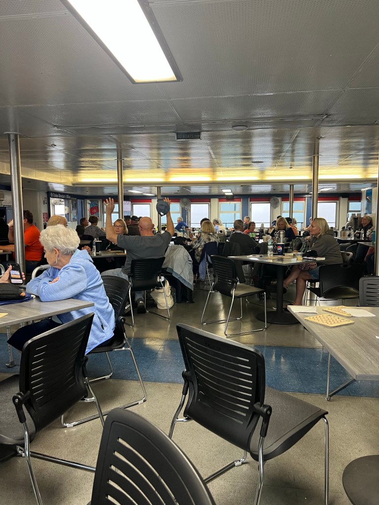 There are two decks… upper with outdoor seating in the front and enclosed in the back. There’s an upper inside cabin with a cafeteria style restaurant and tables. On the middle deck there’s a smaller cafeteria, bingo hall, movie lounge, small museum, gift shop, arcade and State Rooms you can rent for lounging, sleeping etc. In the summer on the “red-eye” these might be handy. Nothing in all the sitting areas has anything conducive to sleeping!