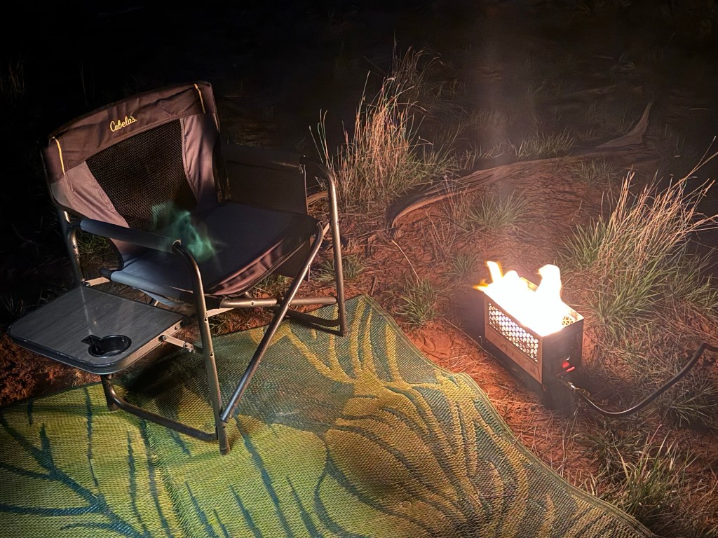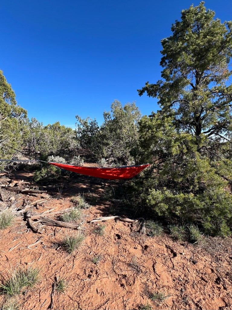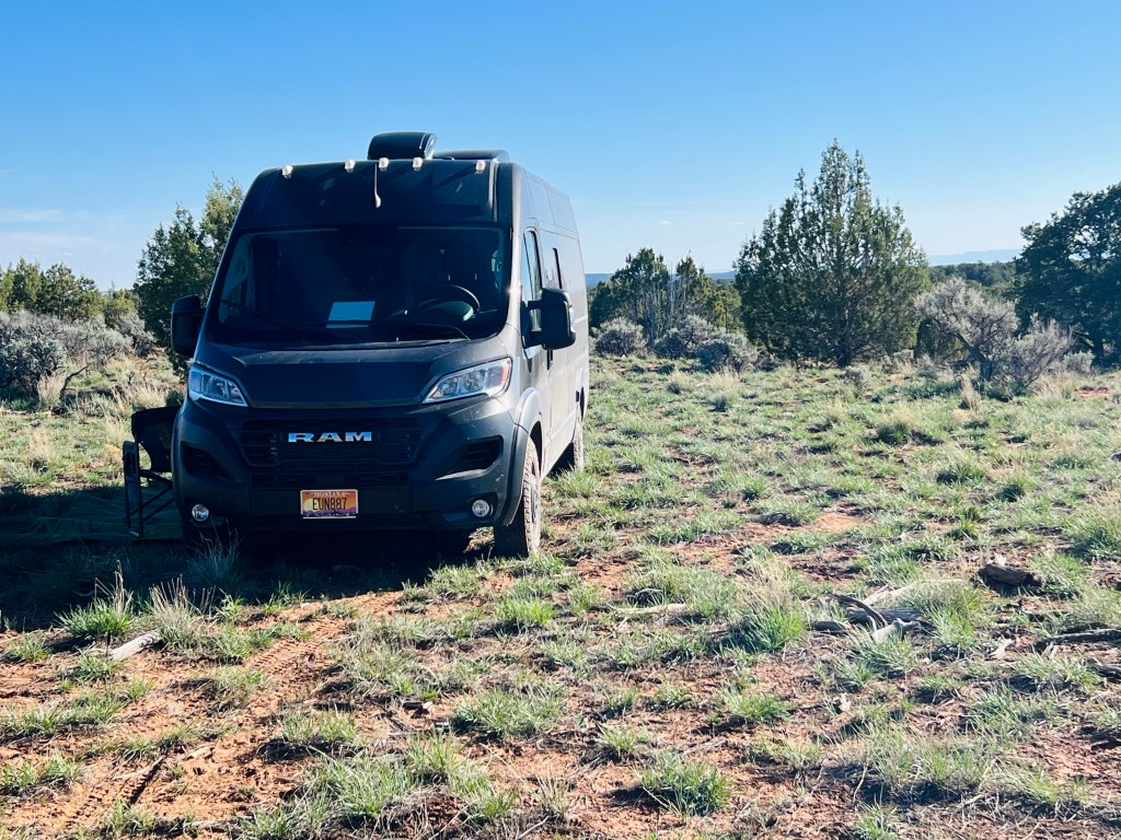 Quiet road to our wild camp spot. Last stretch of the day was heading toward Natural Bridges National Monument… tomorrow’s adventure. Jim had identified a potential wild camp spot (on Ioverlander) so he took the Driving skill #3 test. It was an old jeep trail about 1/2 mile off the highway in the pinyon pines and juniper trees (of course). Just getting off the highway was the scariest part… which Jim later admitted was the trickiest. We do not have a 4X4 Sprinter. Ours is a Ram ProMaster front wheel drive. But we do have new all terrain tires. We found the spot. It’s a lovely quiet flat area to park for the evening. We set up camp (rug, lawn chairs, hammock, ammo can firepit). Enjoyed another couple hours of afternoon, good dinner and campfire with the half moon and stars. The BEST kind of camping. All alone… just nature.