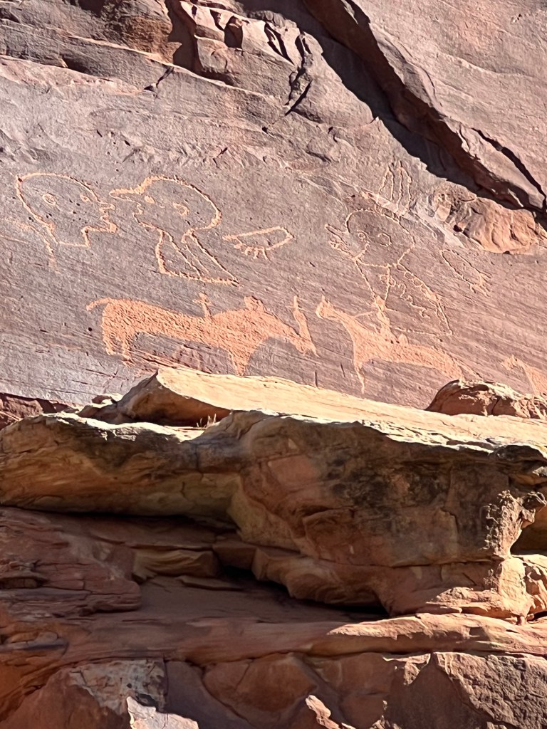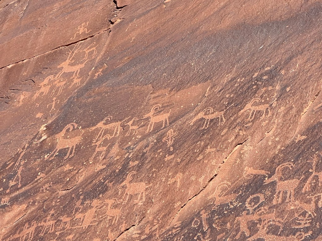 Petroglyph Panels. From camp this morning we walked the short trail that had many petroglyphs marked. There were quite a few and then, sadly, places that had been vandalized before the area was protected.