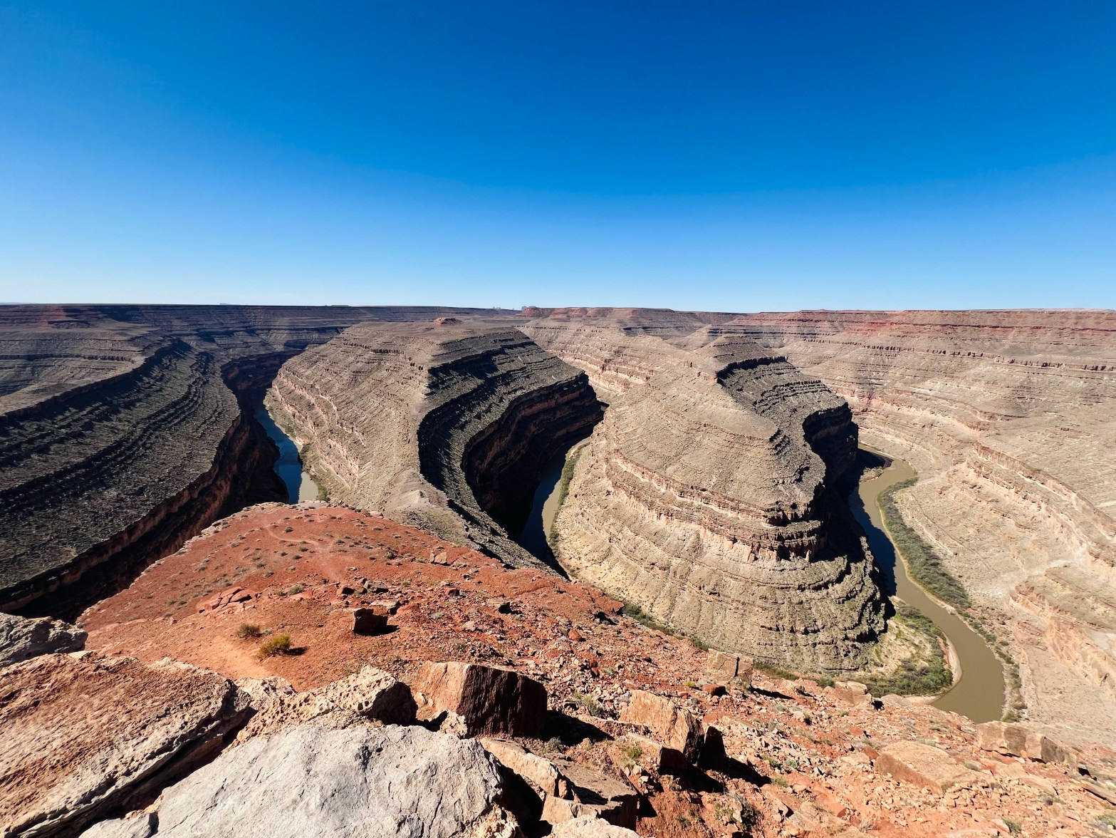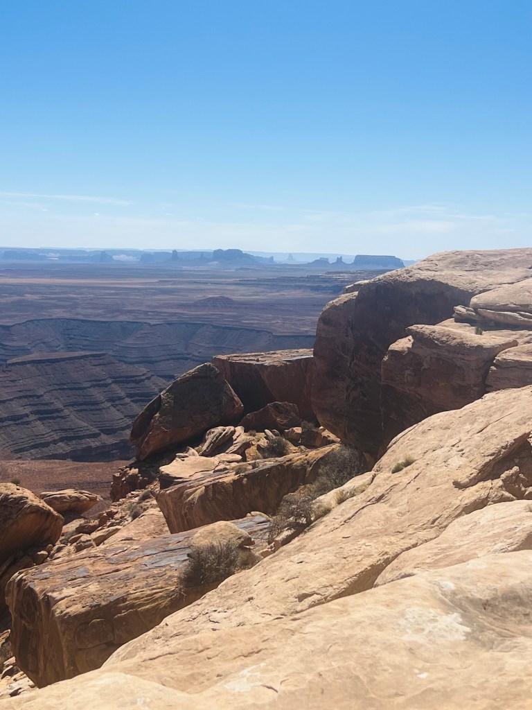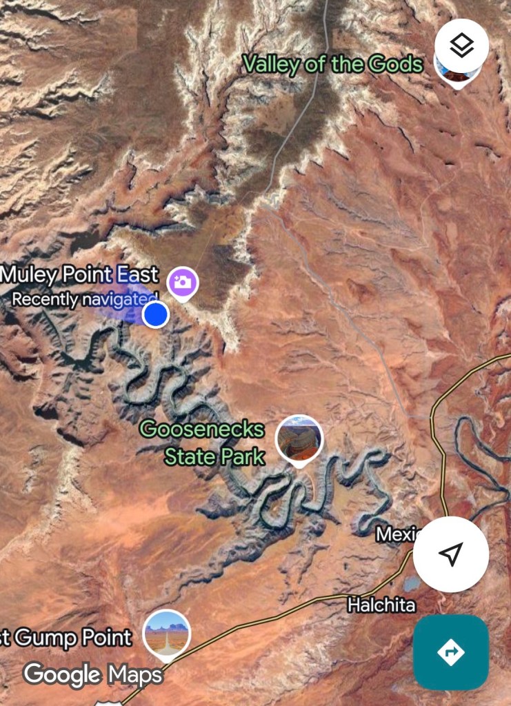 Muley Point. From that driving adventure onto the next short drive down a dirt road to a point overlooking the goosenecks once again and looking south toward Monument Valley on the UT AZ border. This viewpoint was within the Glen Canyon Recreation Area operated by the National Park Service.
