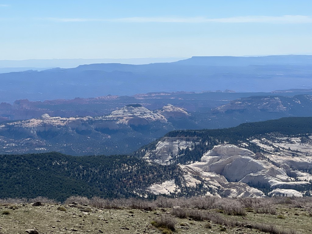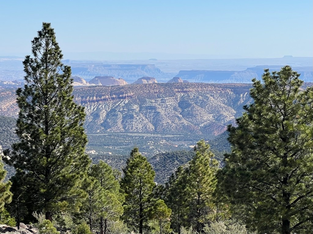 We left Torrey heading south toward Escalante. Immediately upon leaving Torrey you climb up the Boulder mountains into the Dixie National Forest. The summit of the Boulder Mtns is 9680 ft. There were a few pullouts on the way up.