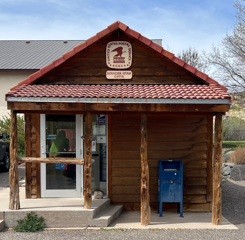 Big downhill into Boulder UT. We did see a touring bicyclist climbing up this pitch into the Boulder Mountains out of the town. It was a 14% incline for two miles and then still climbing for several more! I was feeling for him… I’d probably be walking with my bike loaded. Then later I saw what he had already accomplished…there’s some serious climbing around here!