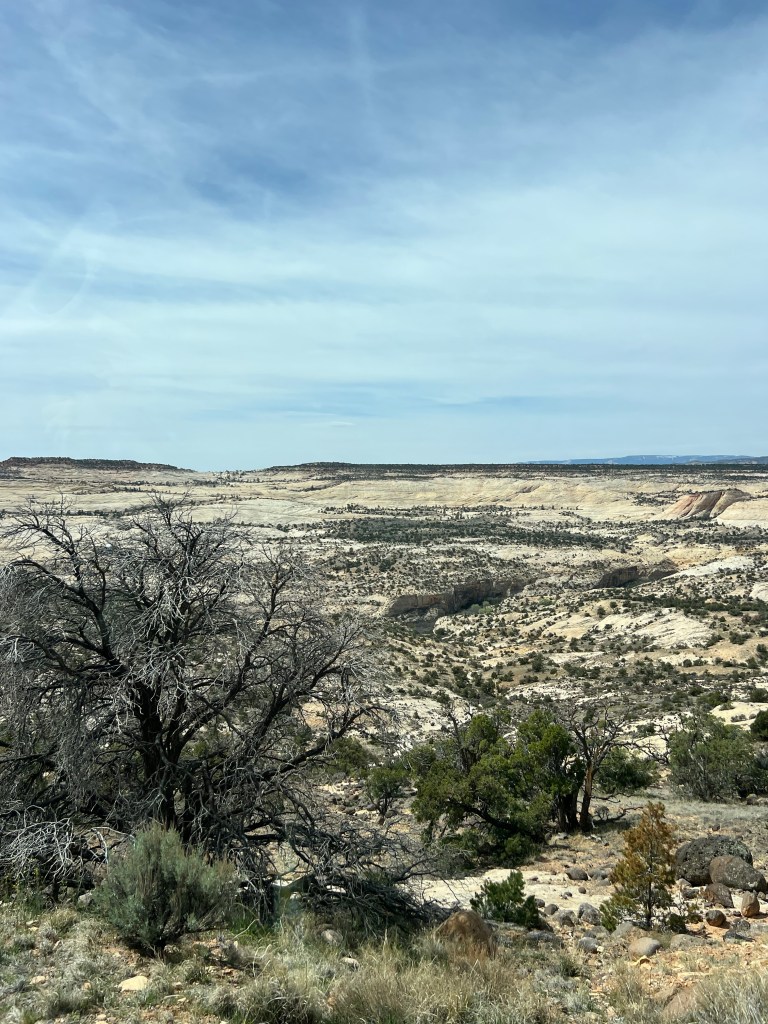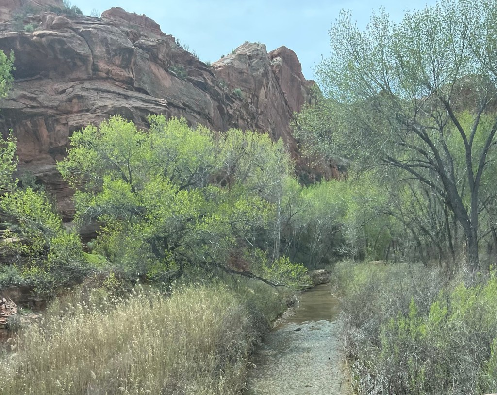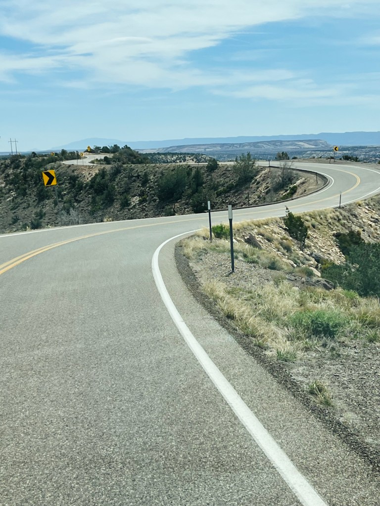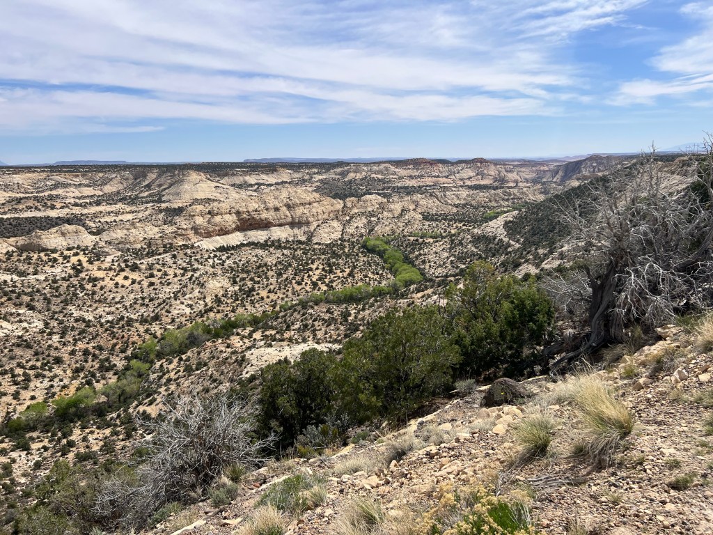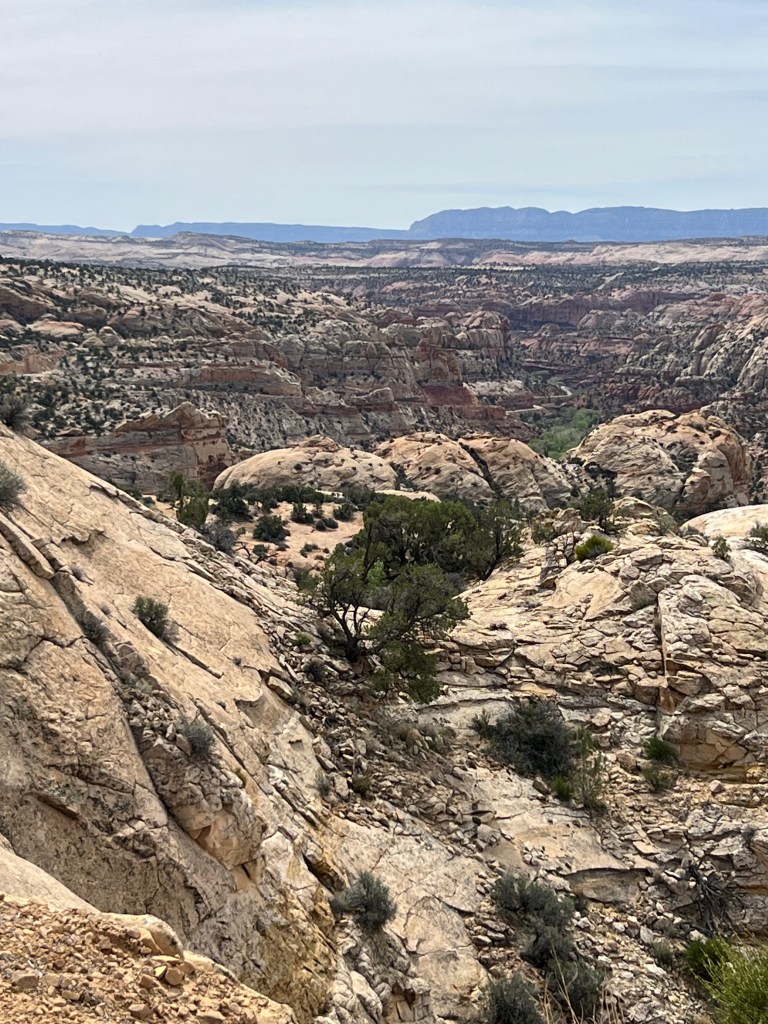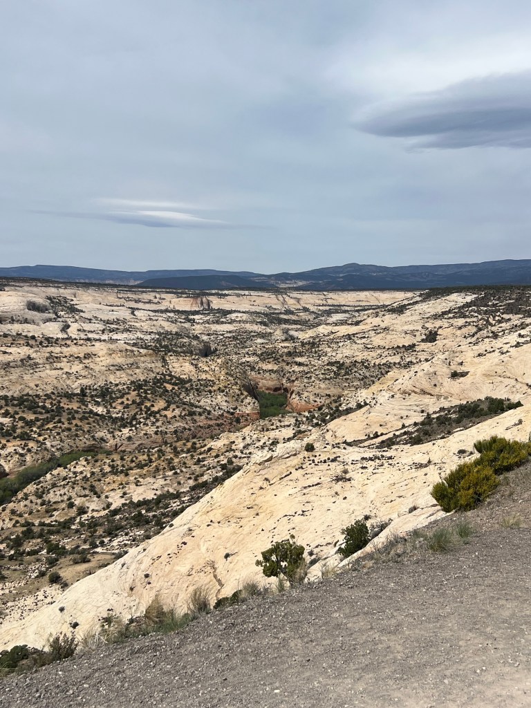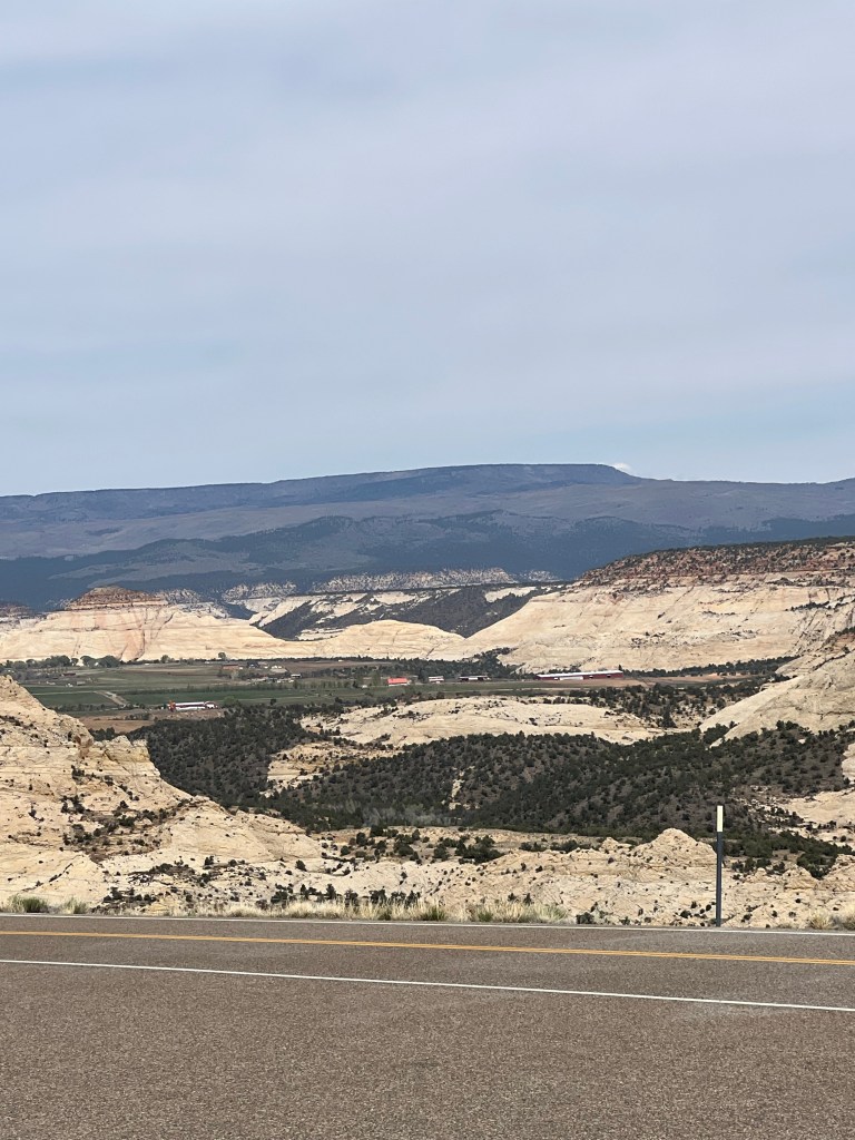 Back to driving to Escalante. This is where the road gets very, very interesting. We started on a huge downhill and then very steeply uphill to a ridge top with deep canyons on both sides of the highway. They said this was the last highway to be finished in Utah connecting Torrey to Escalante. I understand why… first up and over a mountain then up and down several times and snaking along a ridge with steep drops on each side eventually dropping down to the Escalante River and one last steep, steep climb to Escalante town! Holy moly. I’m thinking about the solo cycle tourer that maybe just did this whole climb today (or 2 days if it were me)!
