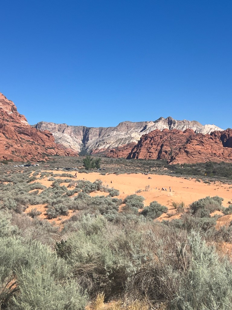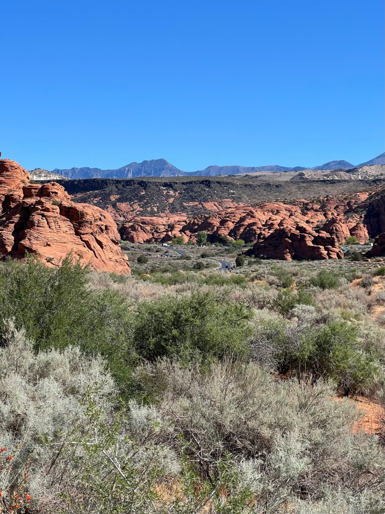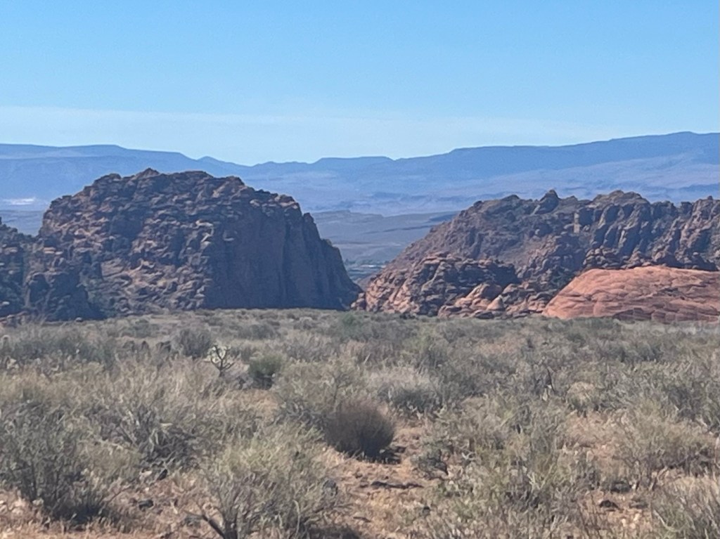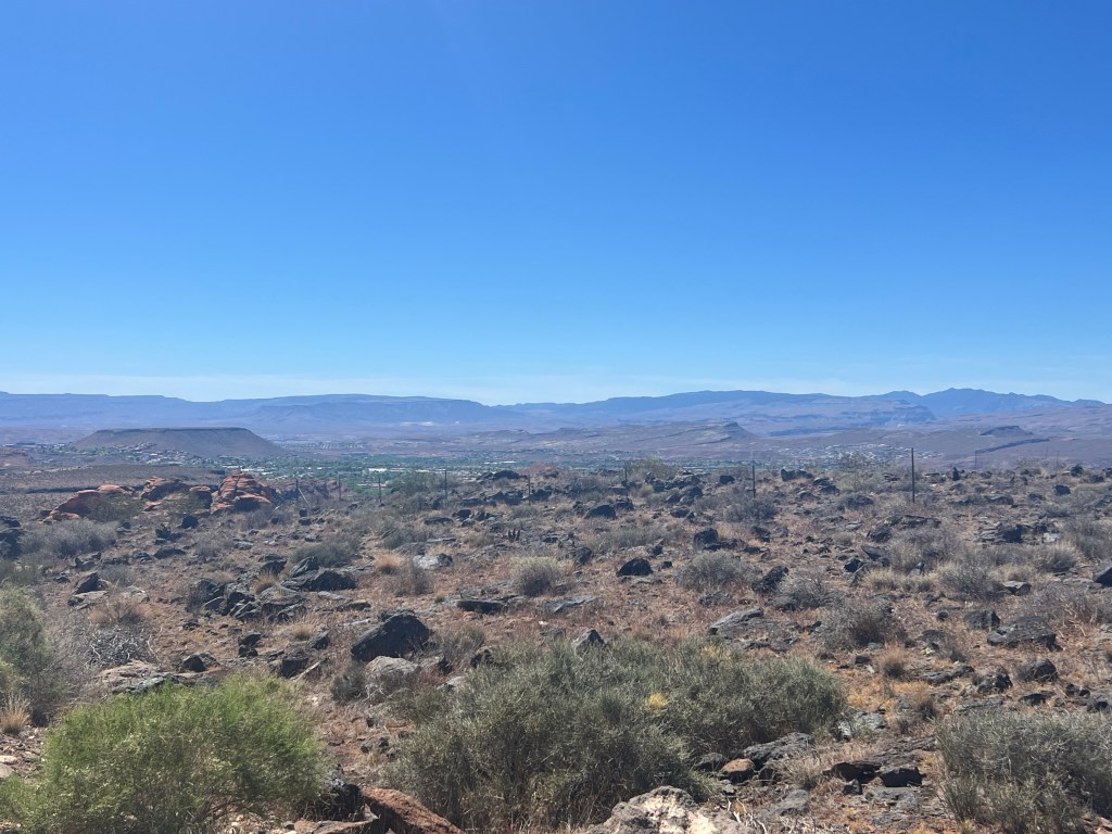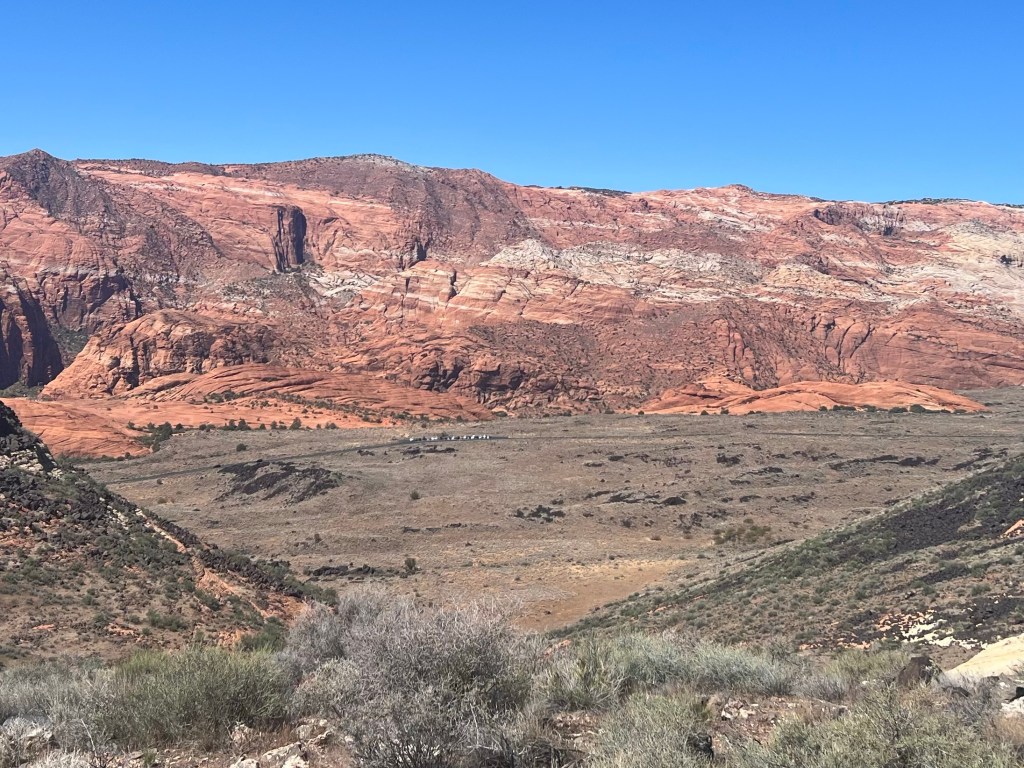 We stopped for a beer and to catch a little March Madness men’s semi-final game. Stayed long enough for Jim to know he wasn’t going to win his bracket. (Arizona was losing, badly, to Michigan). Back to last nights campsite looking toward the Snow Canyon, Red Mountain and The Pine Valley Mountains. We saved our spot with camp chairs and our rug. A few more campers had arrived during the day. Popular overlook!