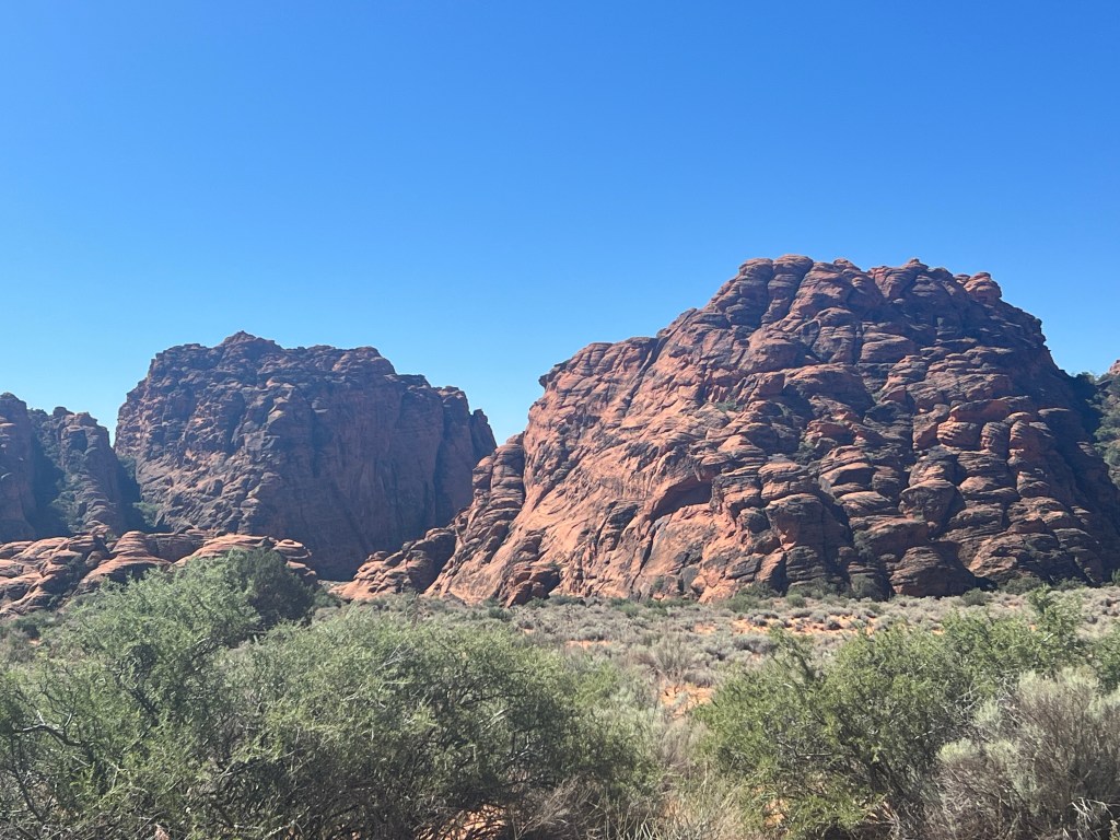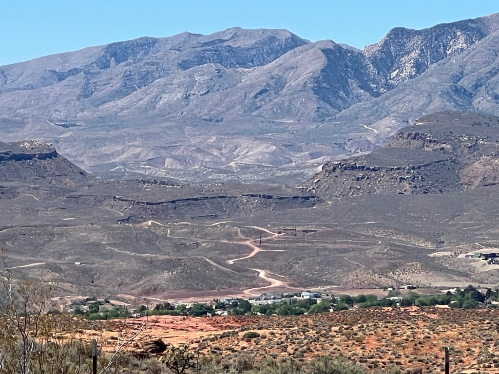 We are impressed with what we’ve seen of St George area so far. The county bike path system is wonderful. It seems with every new road or development they’ve built it includes a paved path on one or both sides. They connect to other trails in other developments or along the major arterials. We are camped and exploring north of St George proper. The homes are mostly the Southwest adobe style with one or two levels, flat roofs and blend in with the red rock surroundings. This high above the Virgin River the developments are mostly gated that we’ve seen. Nice landscaping and really nice looking places to live.