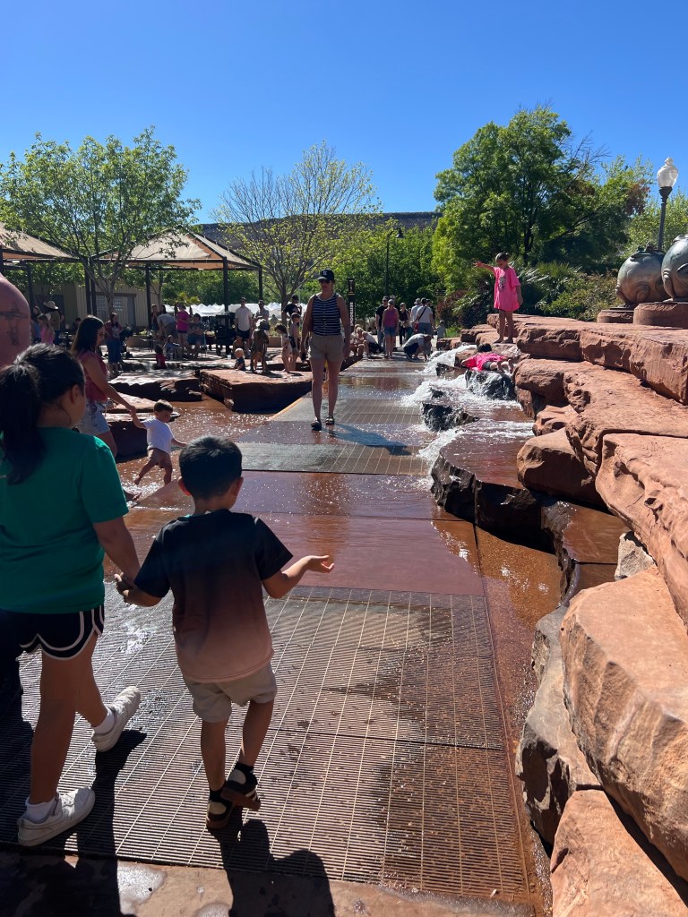 We changed out of biking clothes. A nice feature of living out of the van. We made our way downtown St George to checkout the Arts Festival in their town center. It was warm and busy with families and people. We quickly buzzed through the artists tents. The usual pottery, photography, art paintings, metal art, jewelry etc. However, there was one artist and her porcelain pottery that was unique that caught my eye. She used a Korean technique where she etched her art work into the porcelain then added the dye and wiped it off except where she etched. Her work was fine blue lines on her white pottery. That made the excursion worth it! After that it was the usual food trucks, live music, kids fun areas. Great weekend for this event. Enjoyed seeing all the people having a good time.