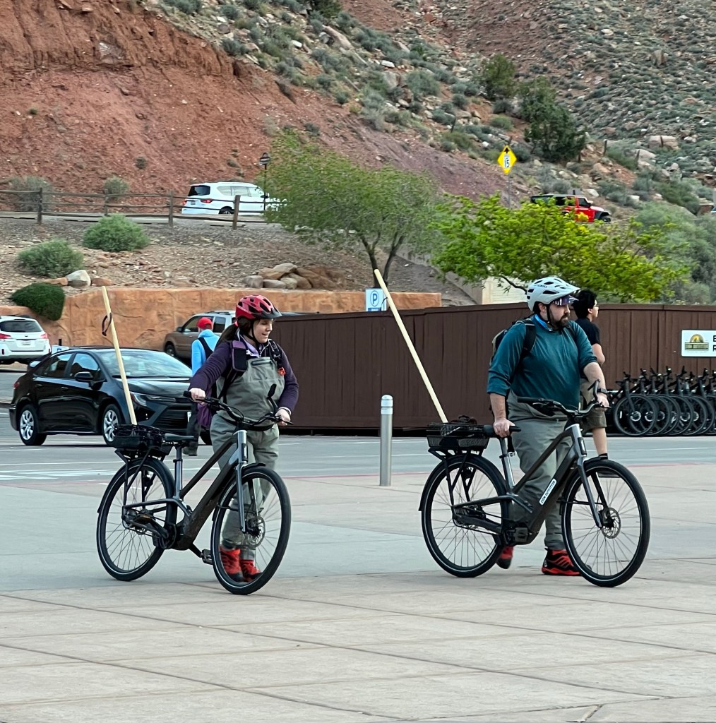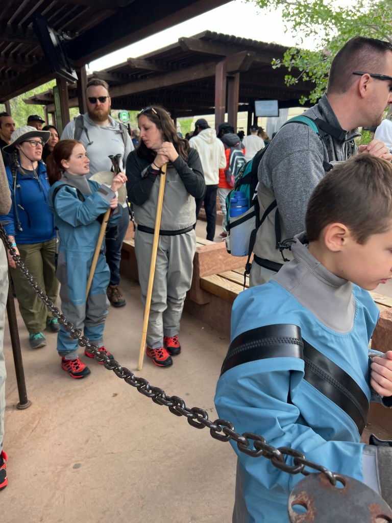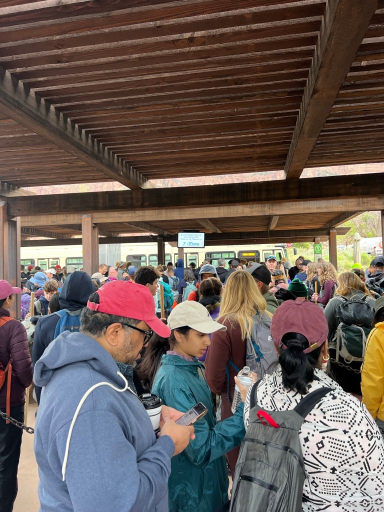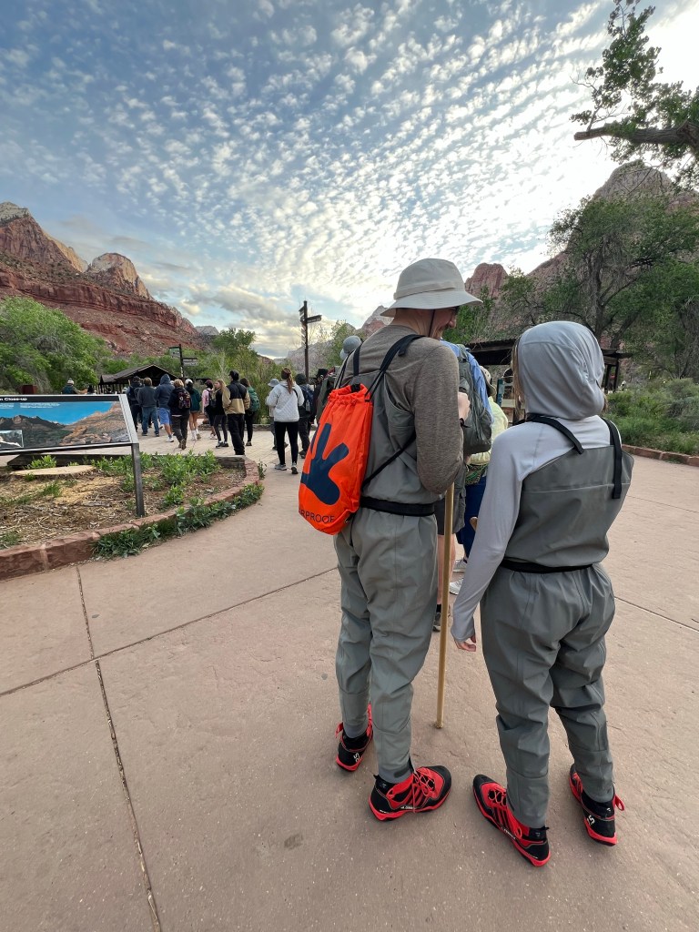 It is about 7:30am when we get into the shuttle bus queue at the entrance. It was about a 30? minute wait at this point. It was good people watching… especially the Narrows hikers. I have since learned that the whole waders and Zion sticks outfits are for wading the Virgin River at the top of the Scenic Drive. If they hike the whole trail it’s about 9 miles but most people only go a mile or two (of course). They wade in the river with waders, boots and poles for balance along rocks as the river goes into a narrow canyon. You can look up photos. This time of year the water is really cold! In summer they can just use the boots. It is a huge Zion thing!! Maybe next time we will do that.