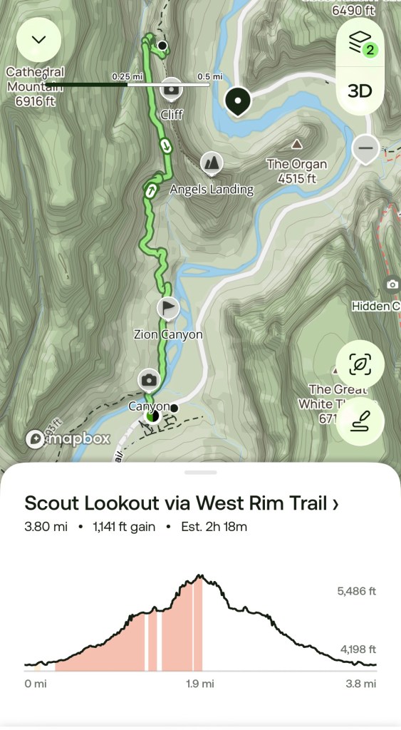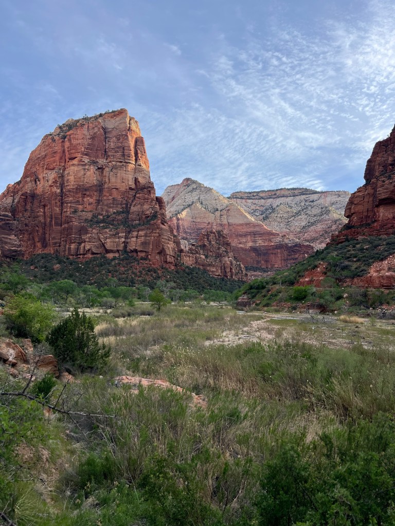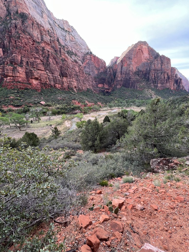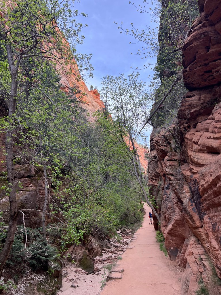 We knew we needed an early start to get a “close to the entrance” parking spot in Zion. After arriving at 10am a couple of days ago and parking 4 miles down, we knew we’d need to start earlier. We were up and out of our campsite by 6am. It was still dark when we arrived in Springdale. Just a few people were moving about. The shuttles up the Scenic Drive start at 7am.