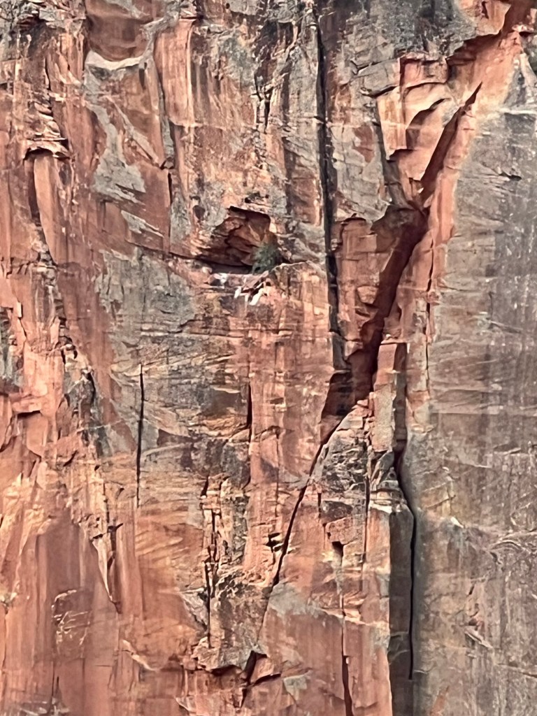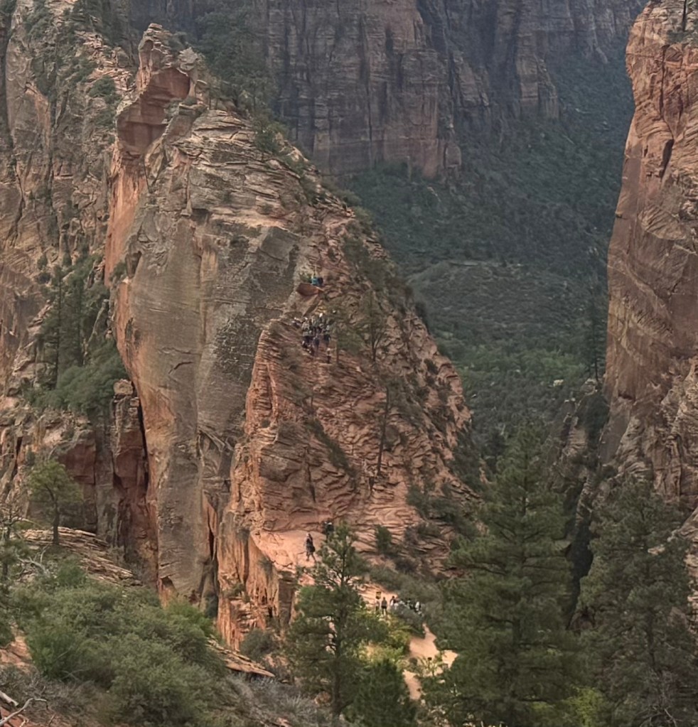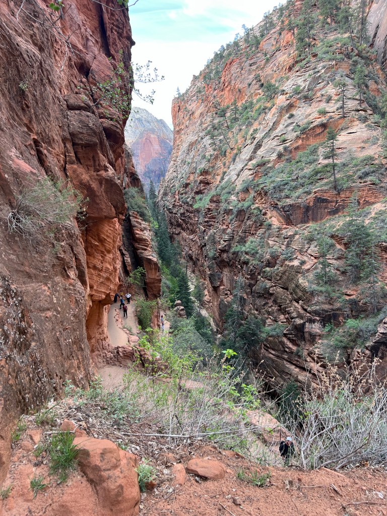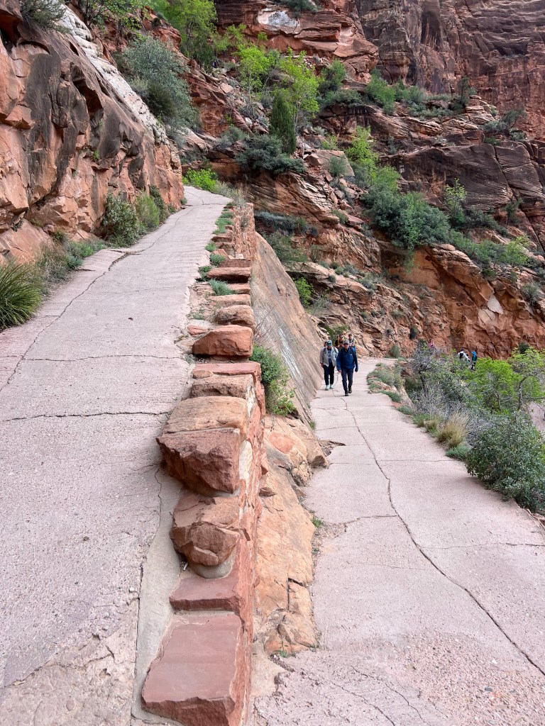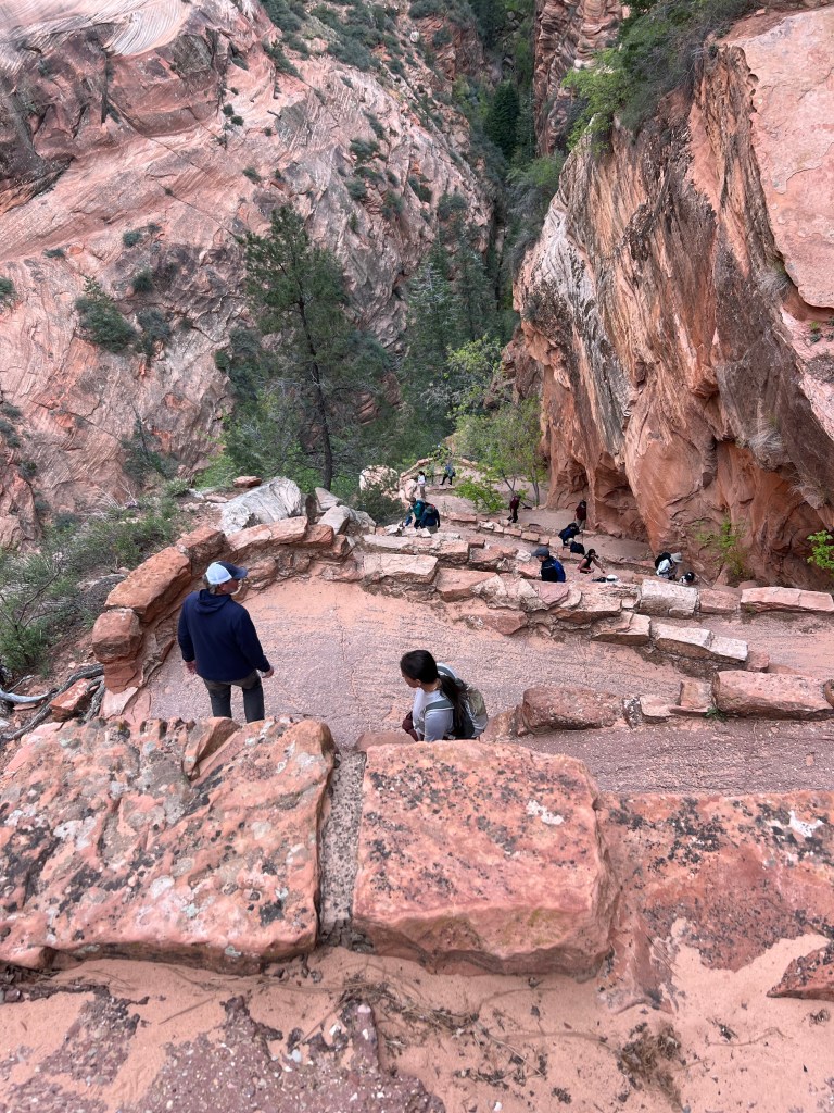 After the wiggle there was a great big ledge to spread out and look down and across the canyon. At this point there is a trail branching off called Angel’s Landing that you can follow a very steep trail up to a higher point. You must have a permit for this trail. It starts with a railing to hold onto as you go vertical. It’s narrow… and looks scary. We were told permits go fast!
