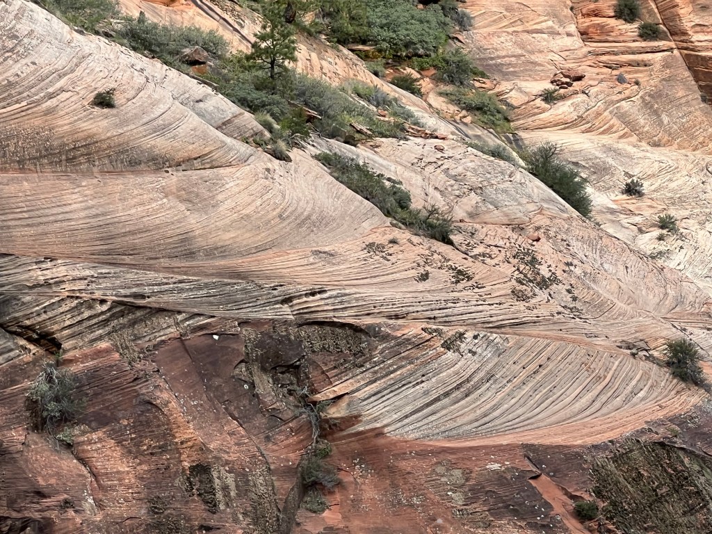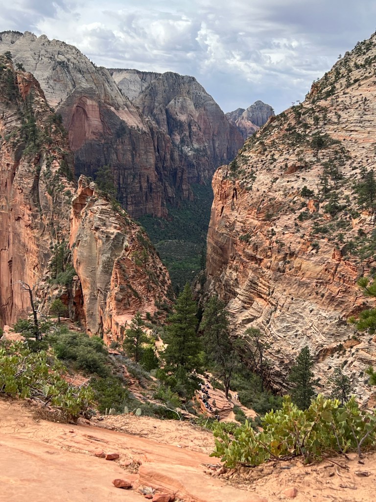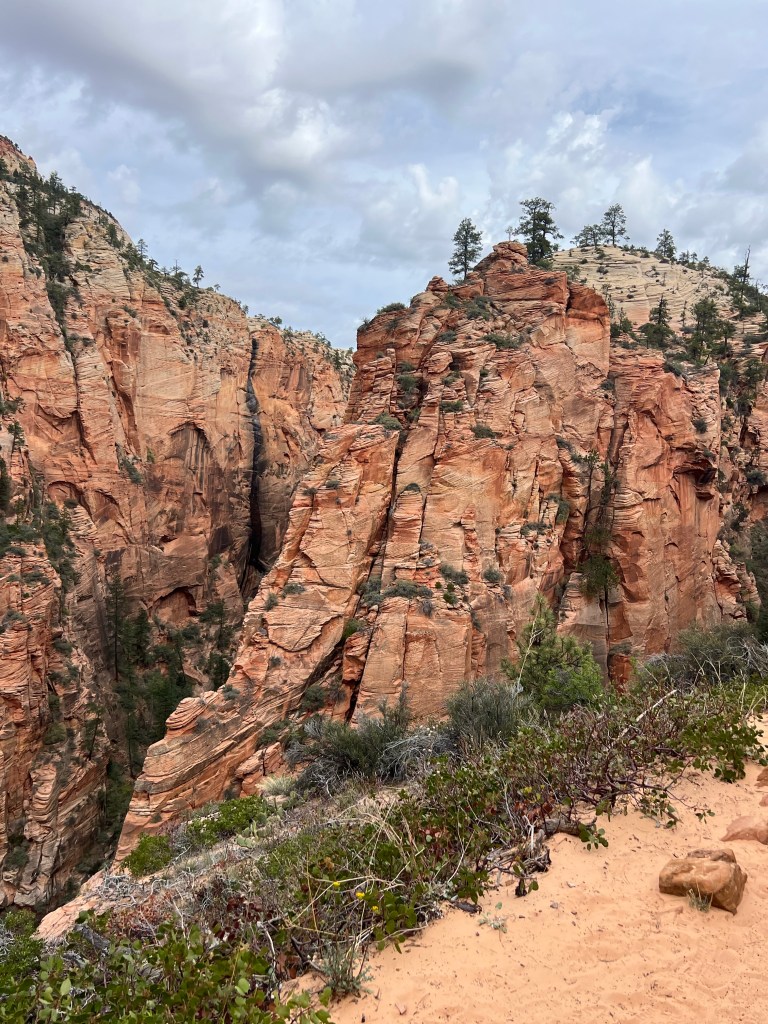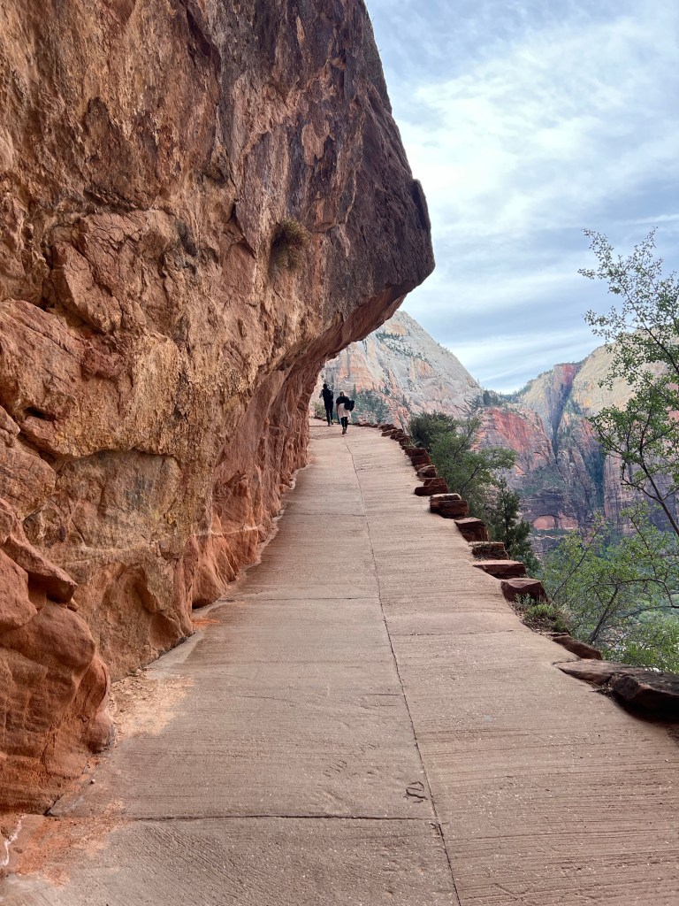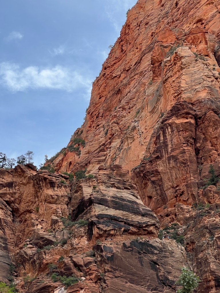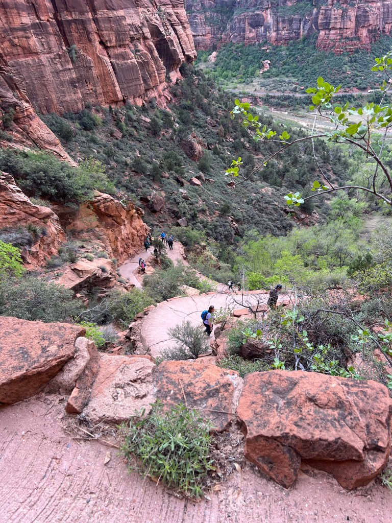 After the wiggle there was a great big ledge to spread out and look down and across the canyon. At this point there is a trail branching off called Angel’s Landing that you can follow a very steep trail up to a higher point. You must have a permit for this trail. It starts with a railing to hold onto as you go vertical. It’s narrow… and looks scary. We were told permits go fast!