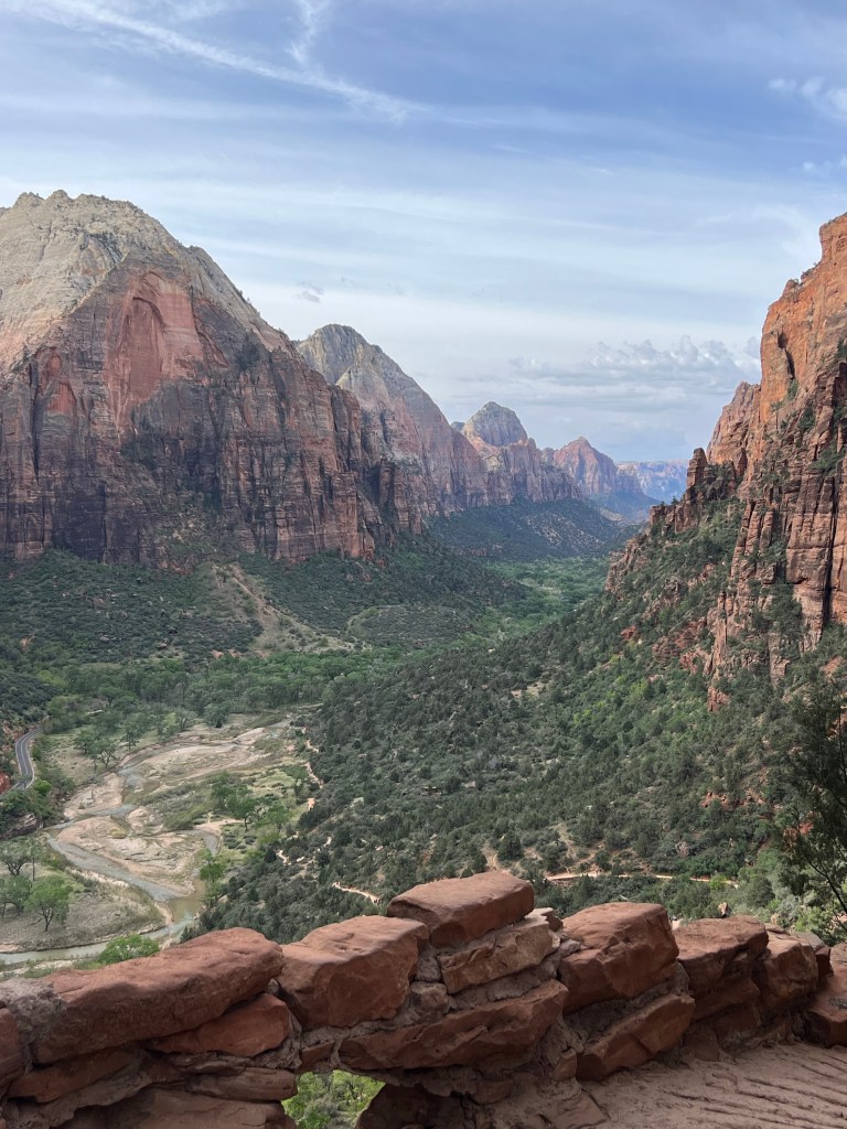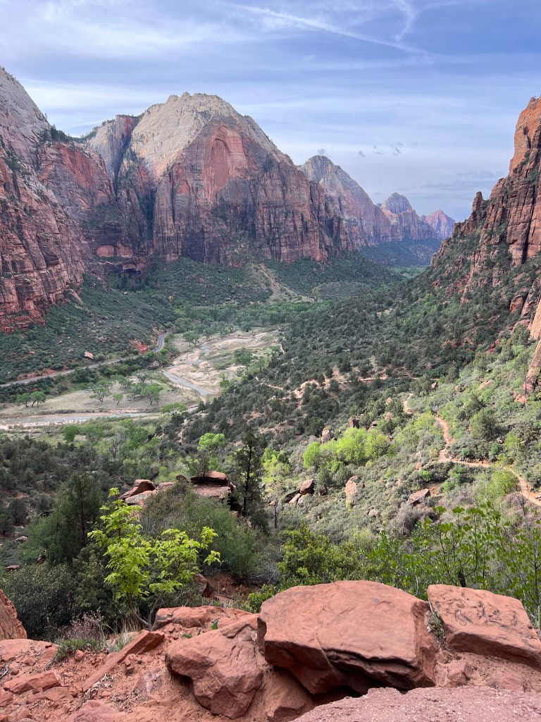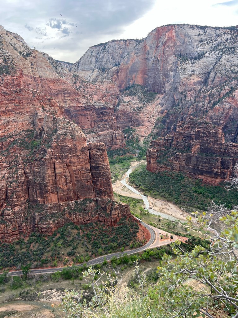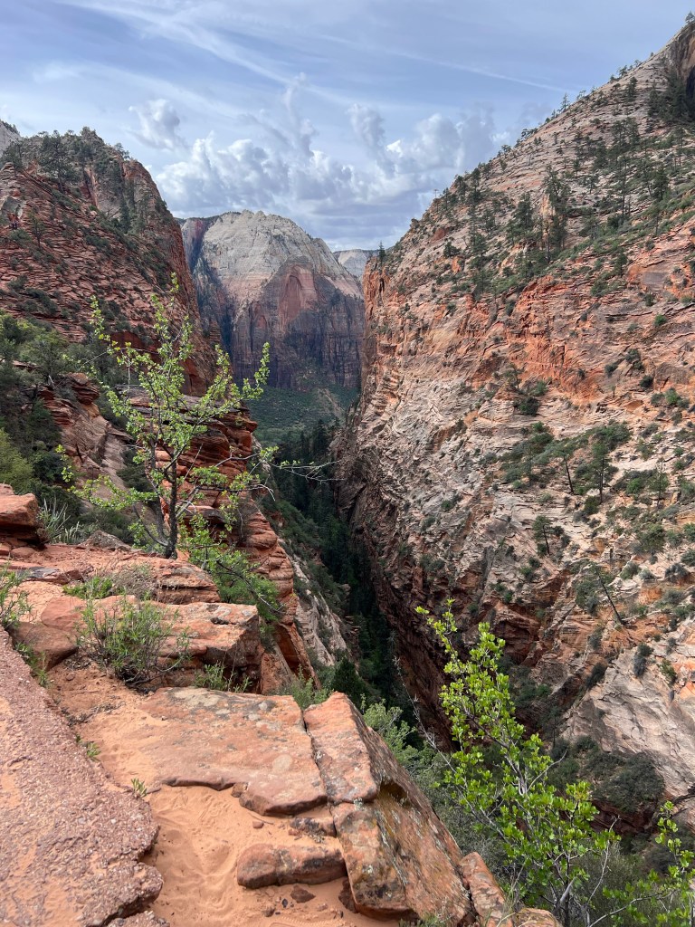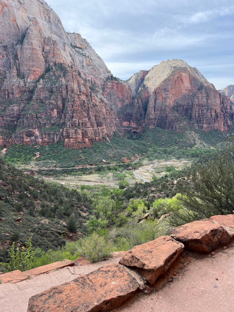 After the wiggle there was a great big ledge to spread out and look down and across the canyon. At this point there is a trail branching off called Angel’s Landing that you can follow a very steep trail up to a higher point. You must have a permit for this trail. It starts with a railing to hold onto as you go vertical. It’s narrow… and looks scary. We were told permits go fast!