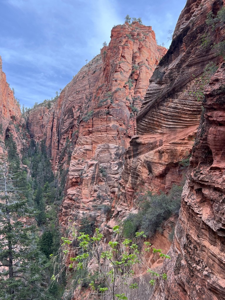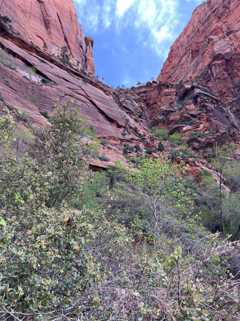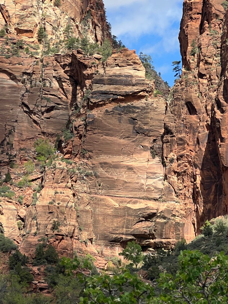 This time we planned to hike the West Rim Trail. We took the bus to The Grotto stop and from there we walked along the Virgin River for a bit before we started going uphill. It didn’t take long for the trail to get steeper. Also… to our surprise it became a concrete trail. I imagine they paved it because it is such a popular trail and thousands of people take this trail. Without the paving it would be destroyed quite quickly. Soon the trail became long switchbacks heading to the rock wall. We were early enough in the day that it wasn’t crowded going up and very, very few people were coming down yet.