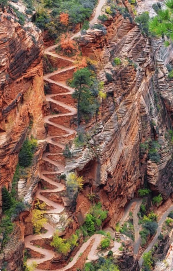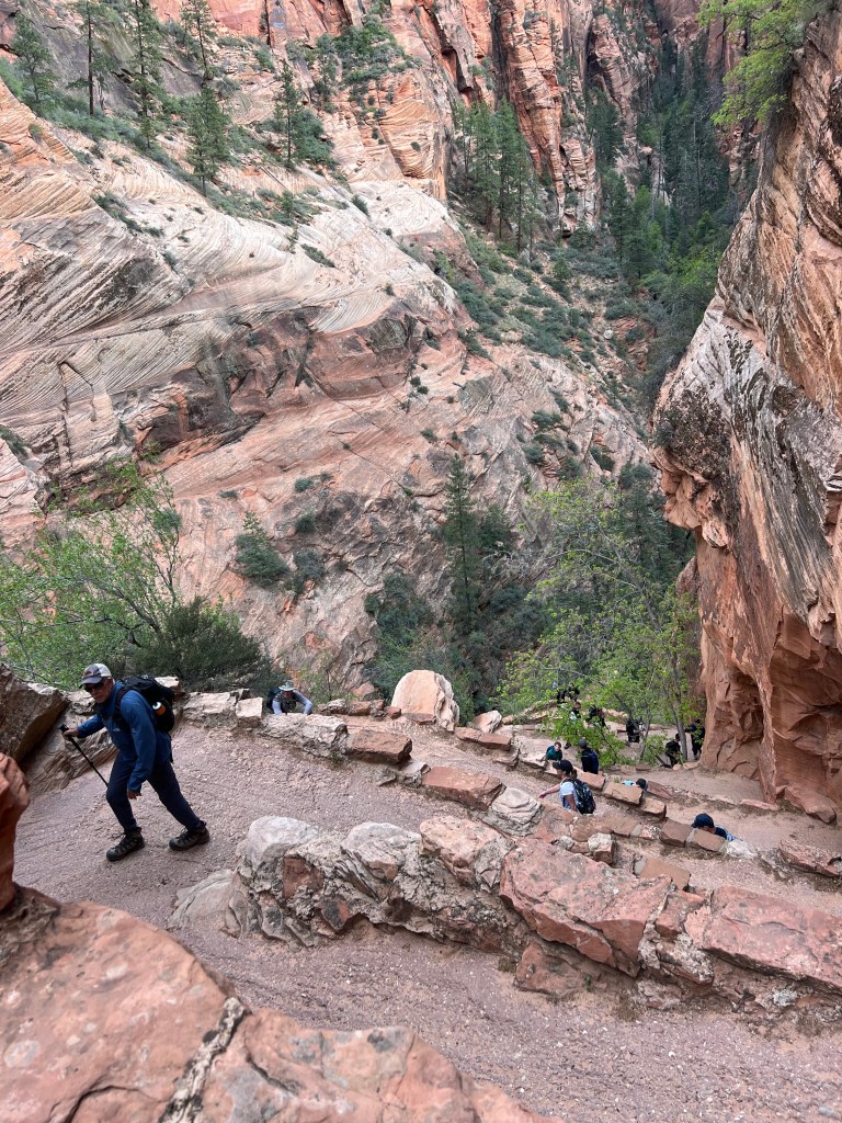 The view looking down canyon along the river was pretty this morning. These switchbacks were not for those afraid of heights. It definitely was a long way down! Because the weather was cloudy and cool early, the temp was comfortable for this exertion. It definitely got us breathing as we went up. It was easy to rest at each turn if we wanted to enjoy the view and catch our breath.