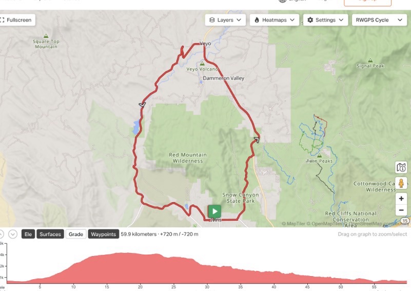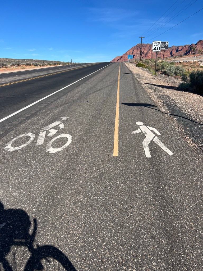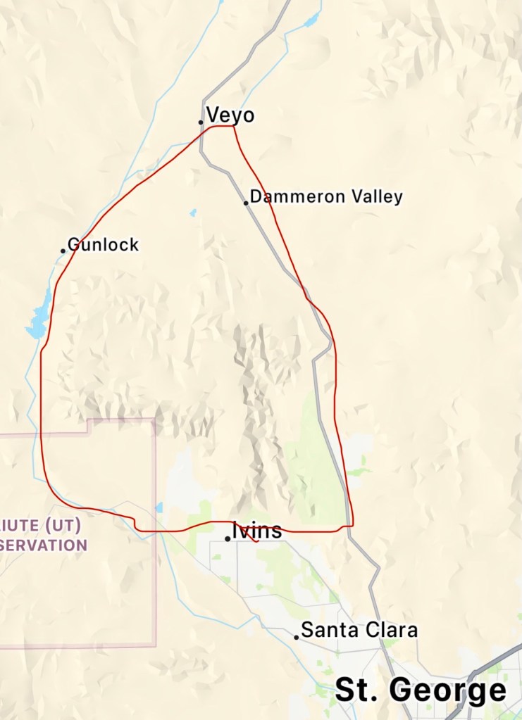 A local’s route. Our longest mileage of this trip. Not quite the most climbing we’ve had but definitely some steep climbing moments and switchbacks. Today’s ride felt like a normal bike ride. Most of it was out in the countryside of St George… the last 5 miles were in the State Park but otherwise tourist and traffic free. Our favorite real ride of this trip. Jim found it on Kamoot. It’s part of a longer route the locals ride. Probably because it was Easter we only saw one cyclist early on then 4 going the other way a few hours later.