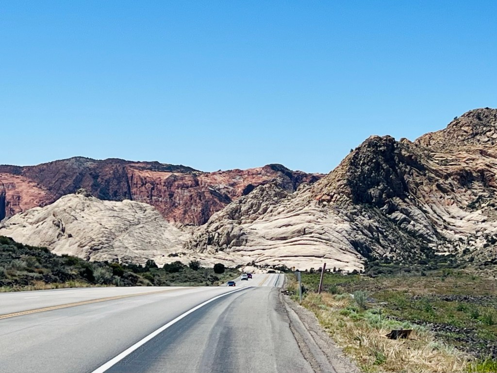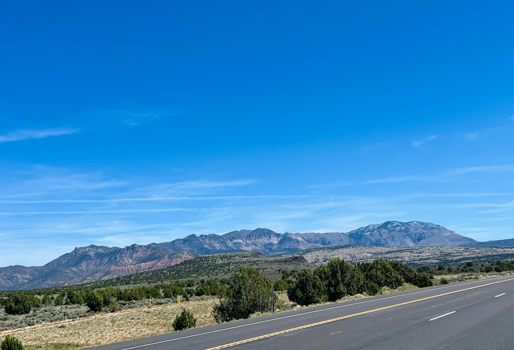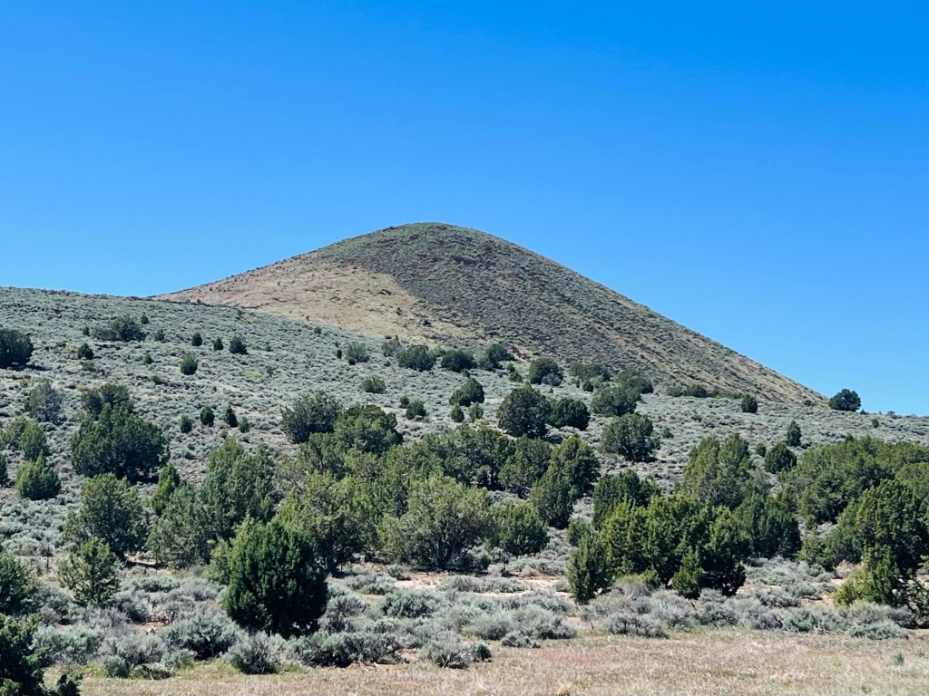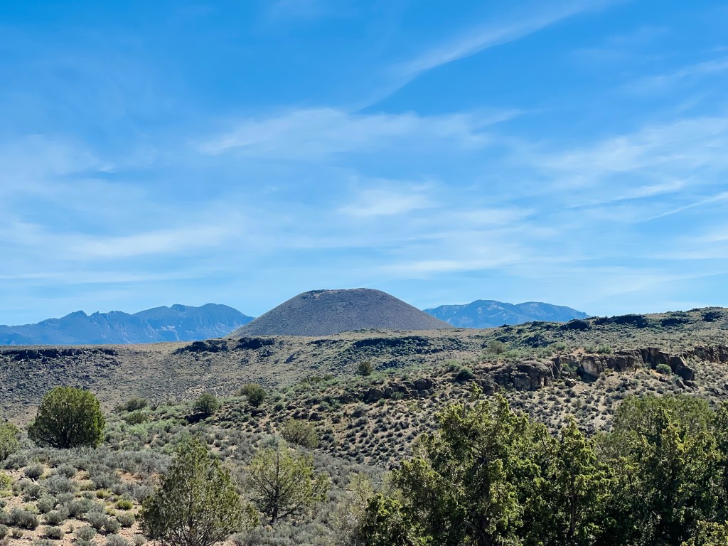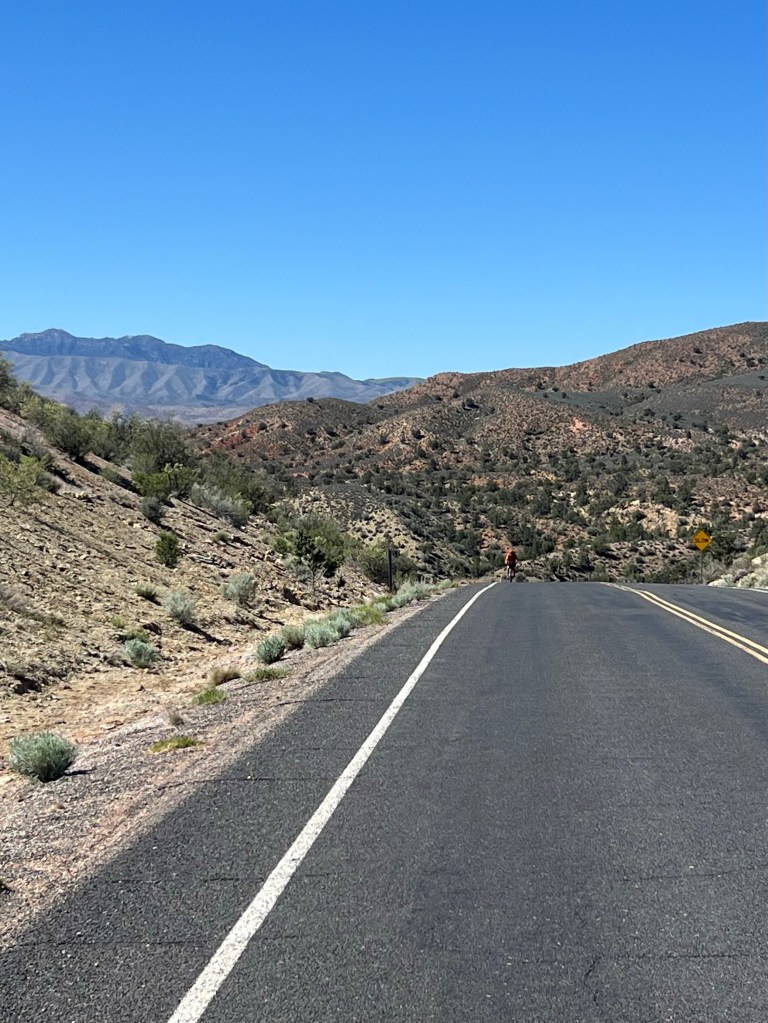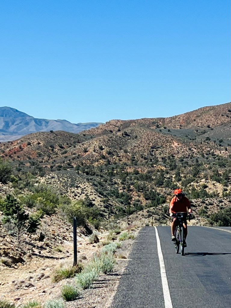 Looking forward to downhill. After Veyo pie stop we thought we’d descend immediately but we had a couple more smaller, easier climbs on the highway. Traffic was busy now (about noon) but the shoulder was wide and clean. We had the Pine Valley Mountains on our left and the volcano on our right.