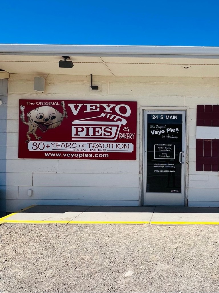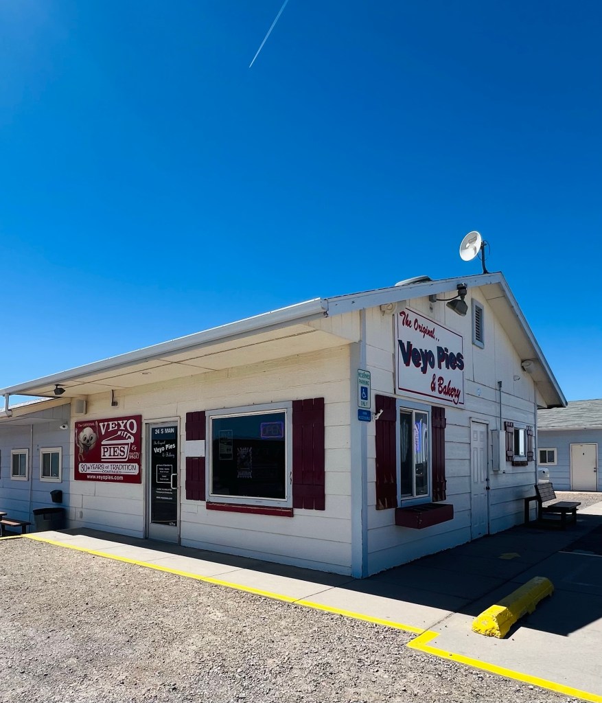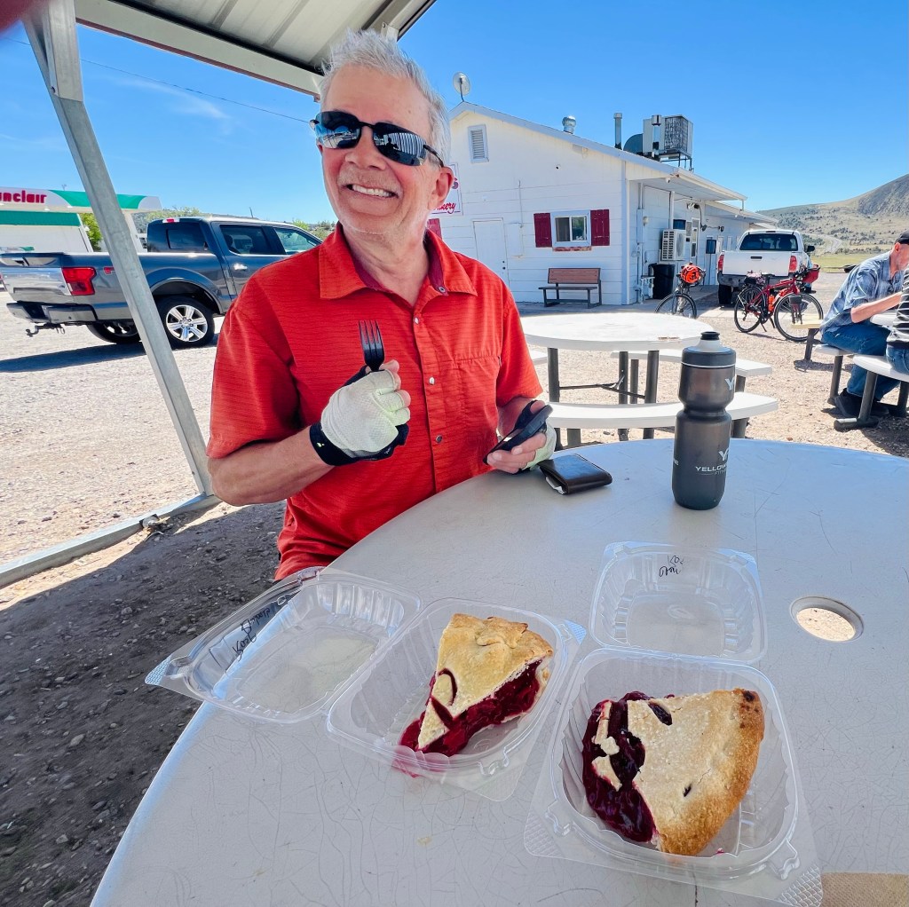 Veyo Pies. Before we hit the switchbacks we had a view of the 3 old volcanos earlier. I had to ask myself if I was in Oregon? Sagebrush, lava and volcanos. Once we got to the top of the switches there was another volcano cylinder…Veyo Volcano… in front of us. We would end up riding 3/4’s of the way around that particular one. Another mile to the town on the junction with Hwy 18. Hwy 18 was what we rode s bit of yesterday. It’s famous for its Pie Shop. I didn’t think it would be open… but boy was I wrong. Pies are good Easter Dinner food. They also sold individual slices. I am not a pie lover but we each had a piece. That was “The Best pie” I’ve ever had. Maybe I was hungry… that helps, but the pie crust was amazing! I usually leave the end of the pie but not this pie crust. So good!! And the flavors we chose? …Raspberry rhubarb and Raspberry Cherry.